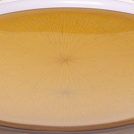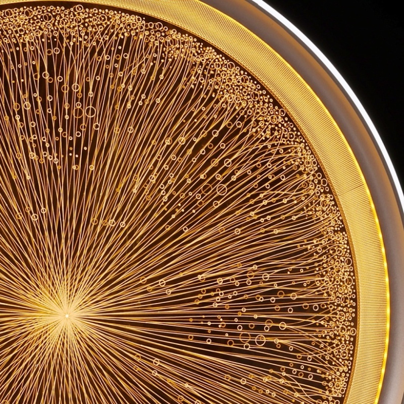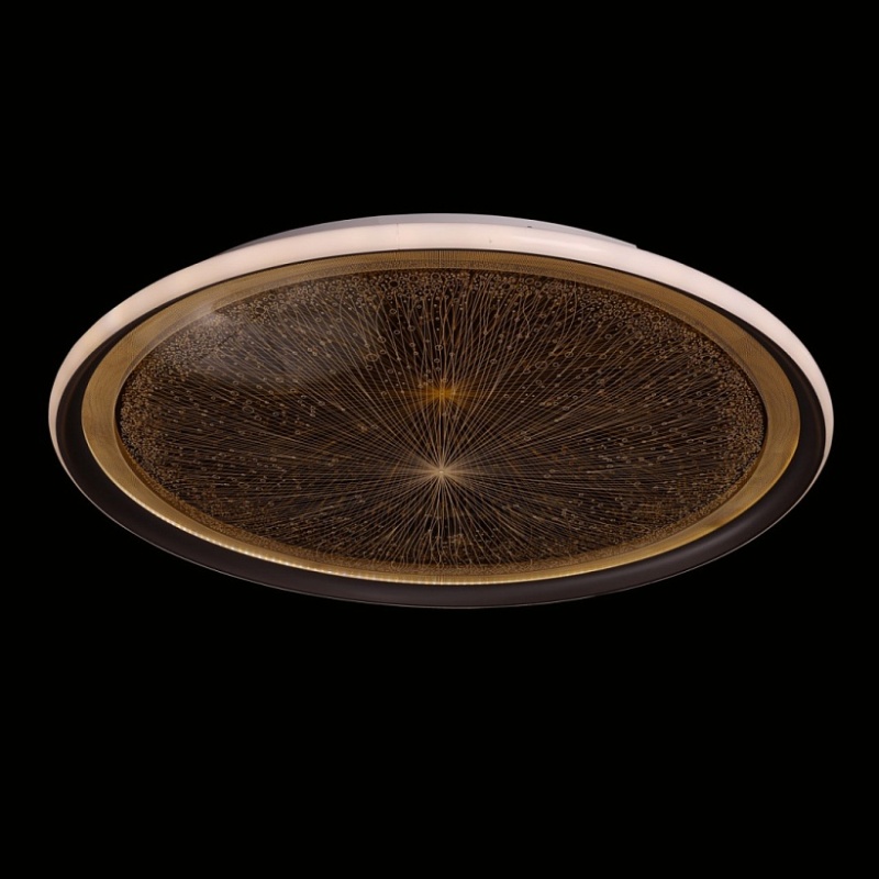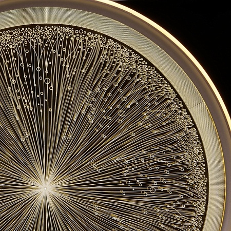 Металлическое основание светильника окрашено в белый цвет. Плафон выполнен из сплава алюминия с цинком и окрашен в цвет серебра. Светодиодные источники света закрыты белым матовым акрилом. Потолочная люстра декорирована металлической пластиной, гальванизированной в цвет золота и прозрачным акрилом с 3D-эффектом.