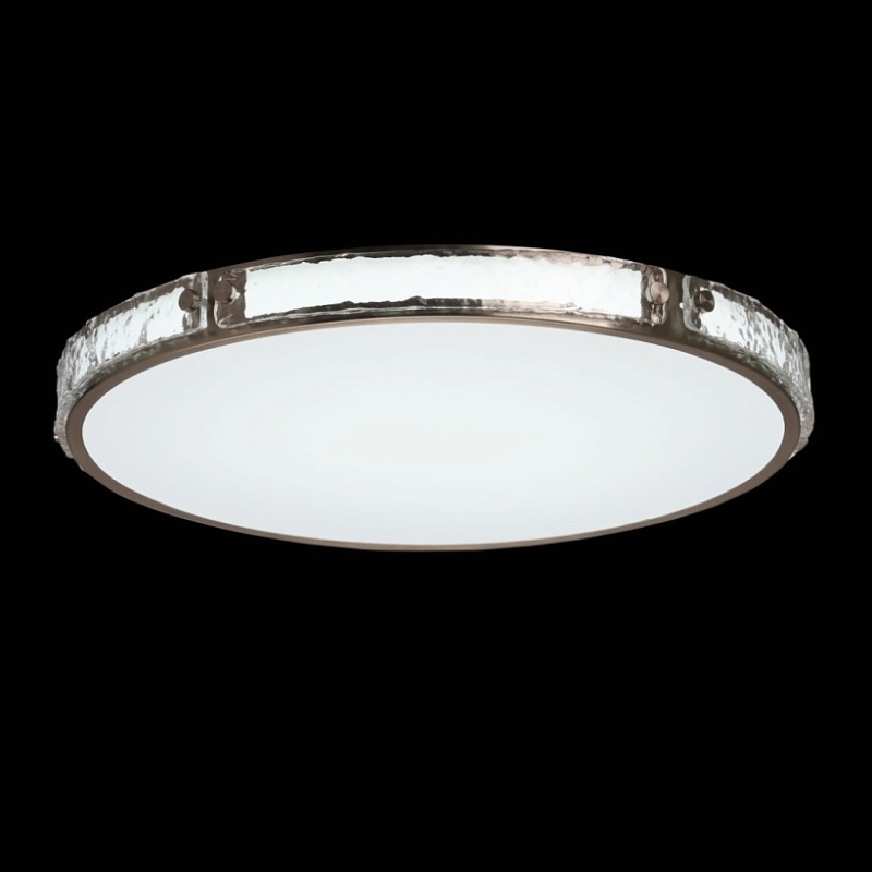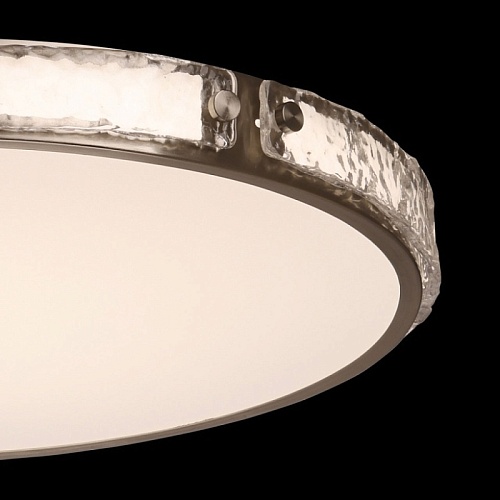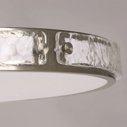 Металлическое основание потолочной люстры гальванизировано в цвет никеля. Светодиодный источник света закрыт белым матовым акрилом. Плафон люстры декорирован прозрачным фактурным стеклом.