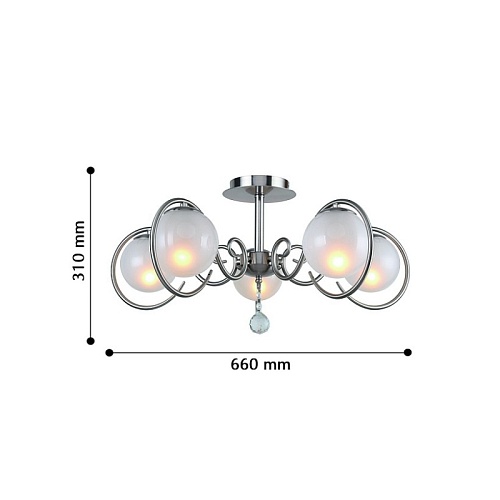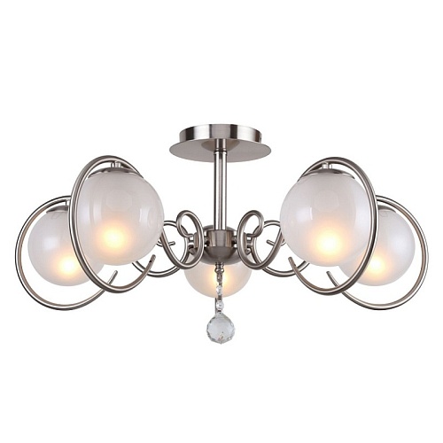Металлический каркас цвета никель, плафоны из белого матового стекла, декор из прозрачного хрусталя.