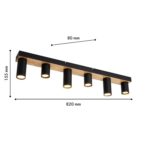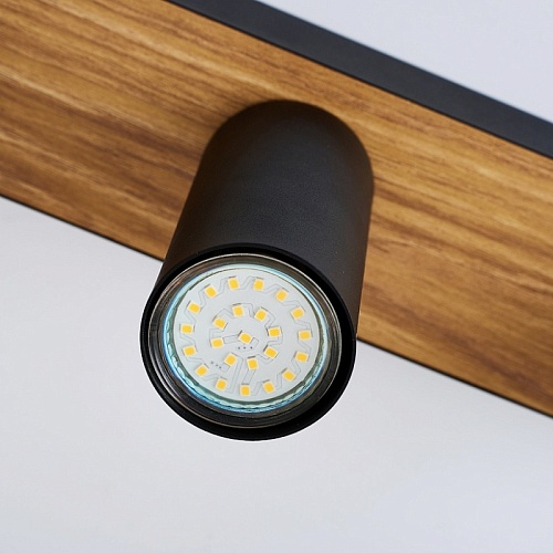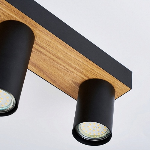 Металлический каркас черного цвета с декоративной вставкой из МДФ с фактурой дерева, черные матовые плафоны, лампа GU10 в комплект не входит.