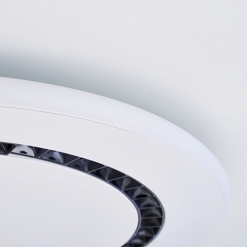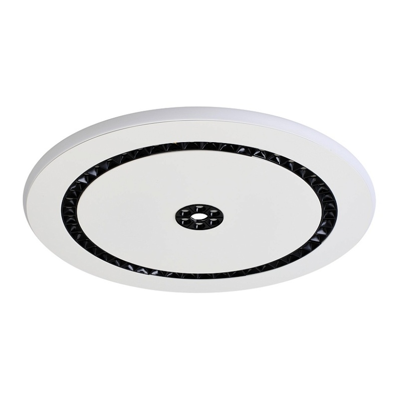 Металлический плафон белого цвета, два типа светодиодной подсветки - лента LED и светодиоды гнездового типа, рассеиватель из прозрачного акрила белого цвета.
