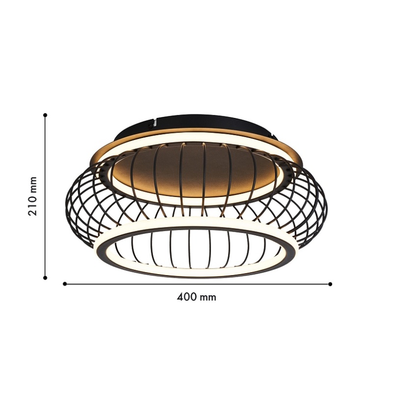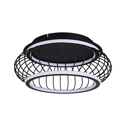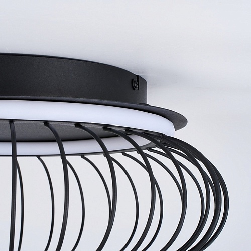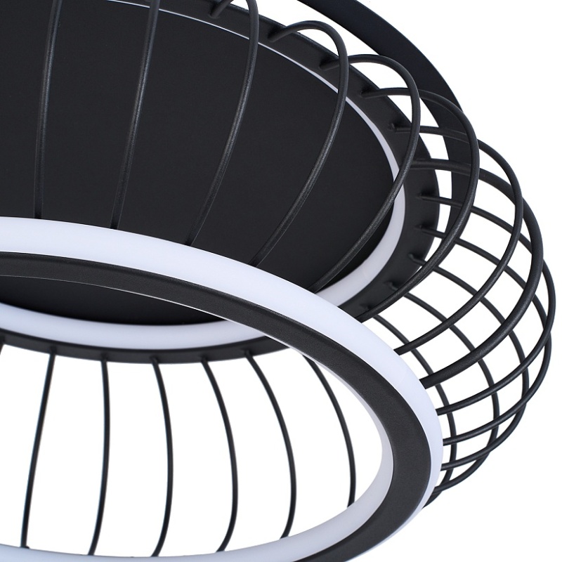 Плафон из черных матовых металлических прутиков, образующих решетку, два световых элемента LED в форме колец с рассеивателем из белого пластика, регулируемые мощность и температуру света, пульт управления в комплекте.