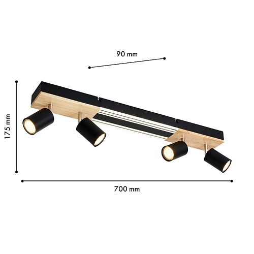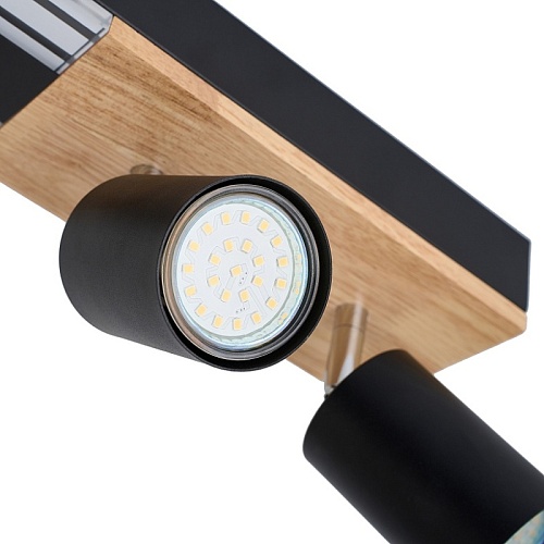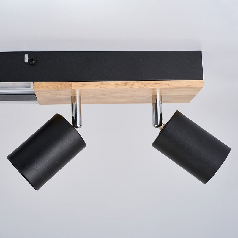 Металлический каркас черного цвета, декоративная вставка из МДФ с фактурой дерева на основании светильника, матовый черный каркас, встроенный LED-модуль, поворотные споты черного цвета.