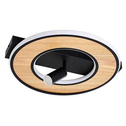 Металлический каркас черного цвета, декоративная вставка из МДФ с фактурой дерева на основании светильника, поворотный спот черного цвета, встроенный источник света по периметру кольца и внутри плафона, регулируемая мощность и температуру света, пульт в комплекте.