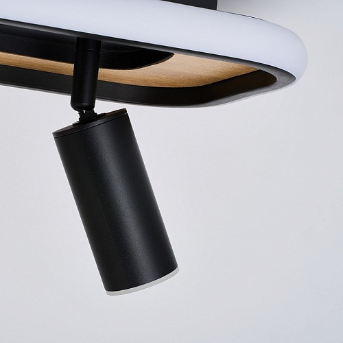 Металлический каркас черного цвета, декоративная вставка из МДФ с фактурой дерева на основании светильника, поворотный спот черного цвета, встроенный источник света по периметру кольца и внутри плафона, регулируемая мощность и температуру света, пульт в комплекте.