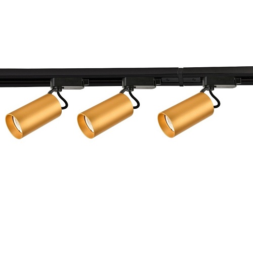 каркас цвета золота, в комплект трековой системы входят: 3 спота, шинопровод (2х1м) и коннектор, угол поворота до 75°, лампу GU10 можно менять