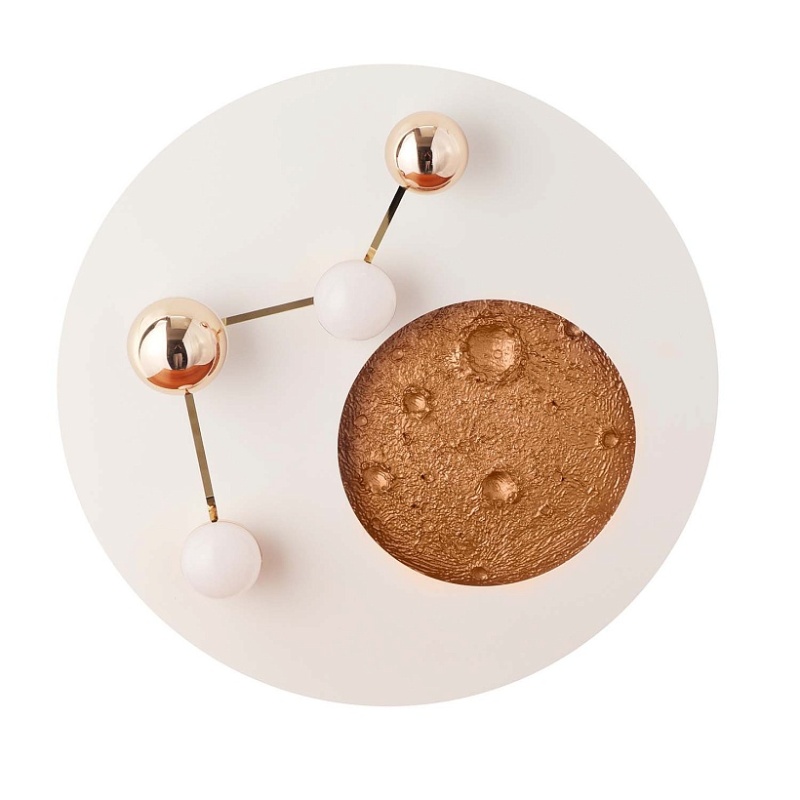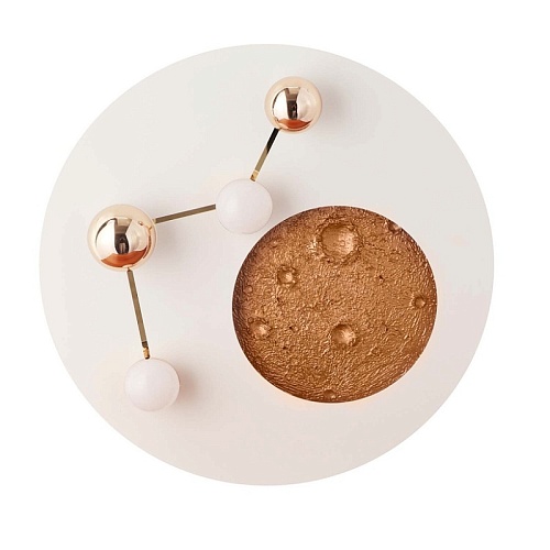 Возможность крепления на потолок или на стену, декоративное покрытие из акрила белого цвета, углубление с изображением луны со встроенной LED-лентой по периметру, плафоны в форме белых и золотых шариков, направляющих свет наружу и на Каркас светильника, встроенный LED-модуль.