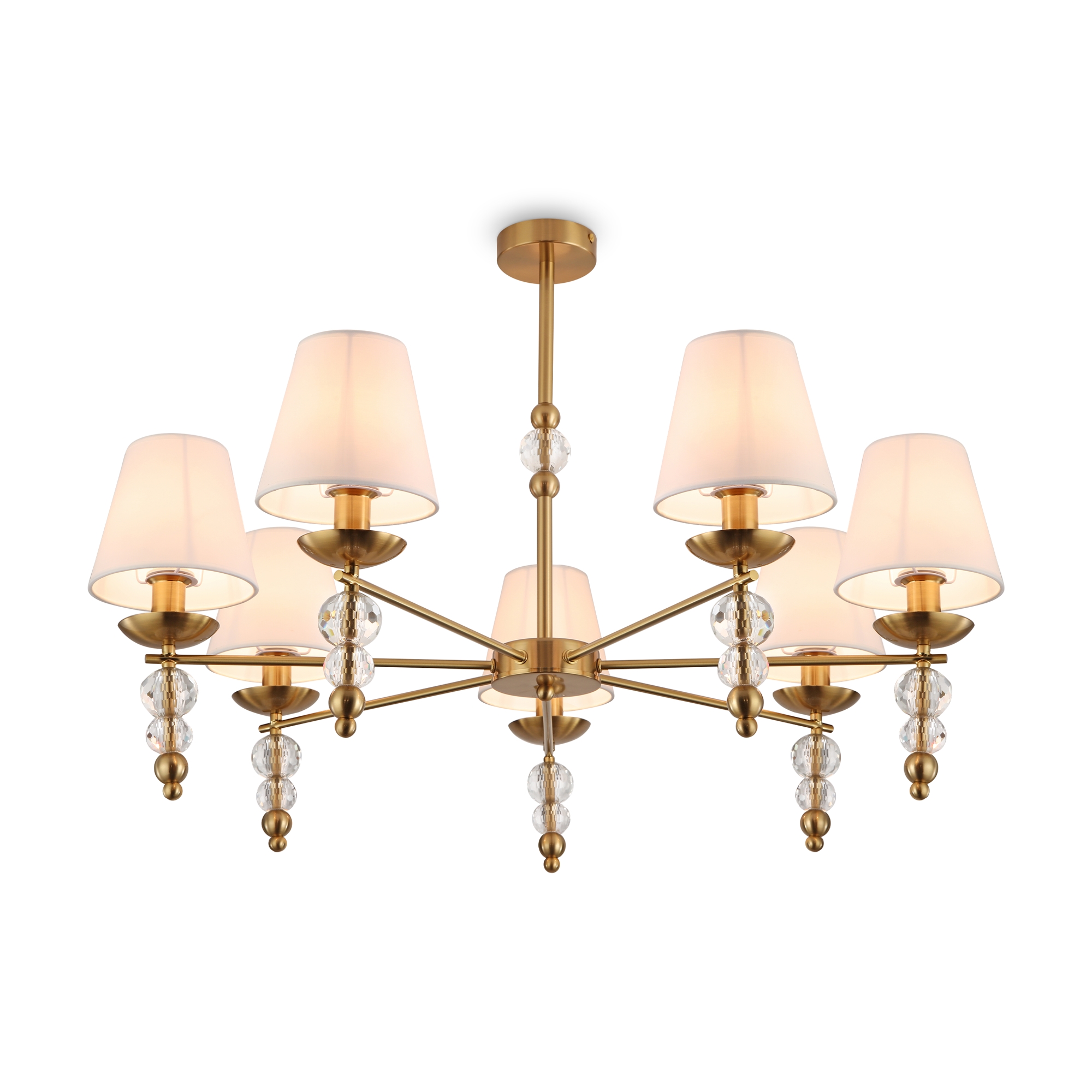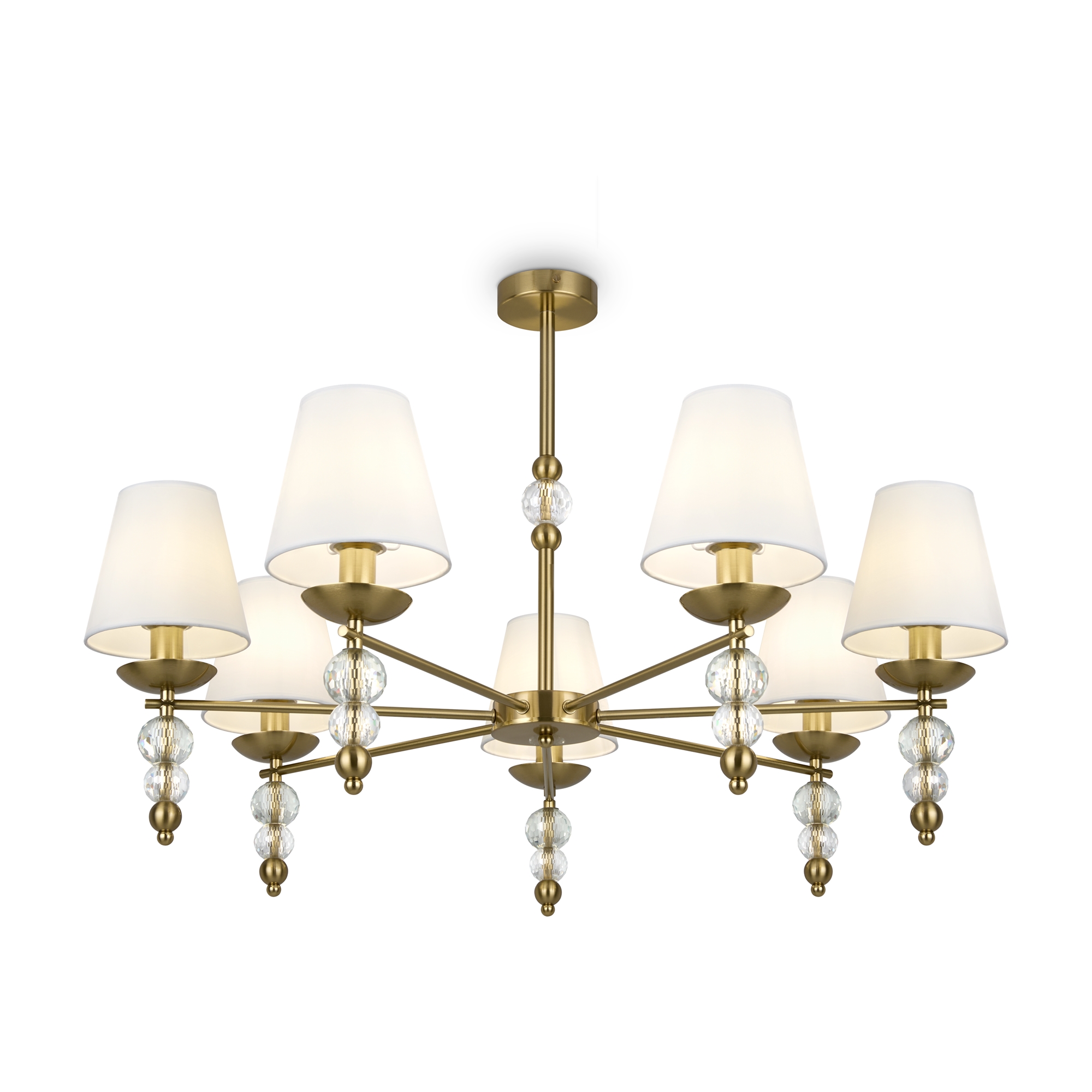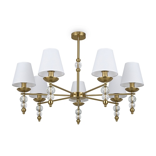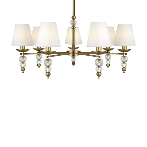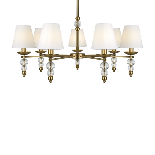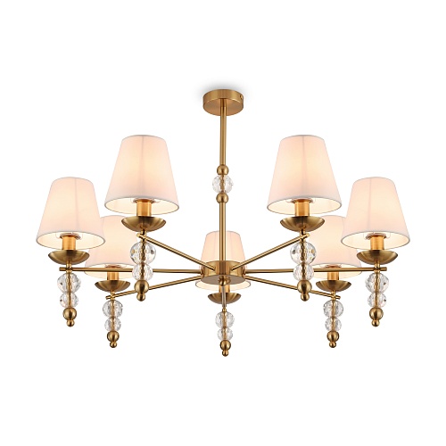 Материал абажура — ткань, цвет — белый. Металлическая арматура в цвете латунь обрамлена хрустальными бусинами. Источник света — лампы с цоколем Е14. Степень защиты — IP20.