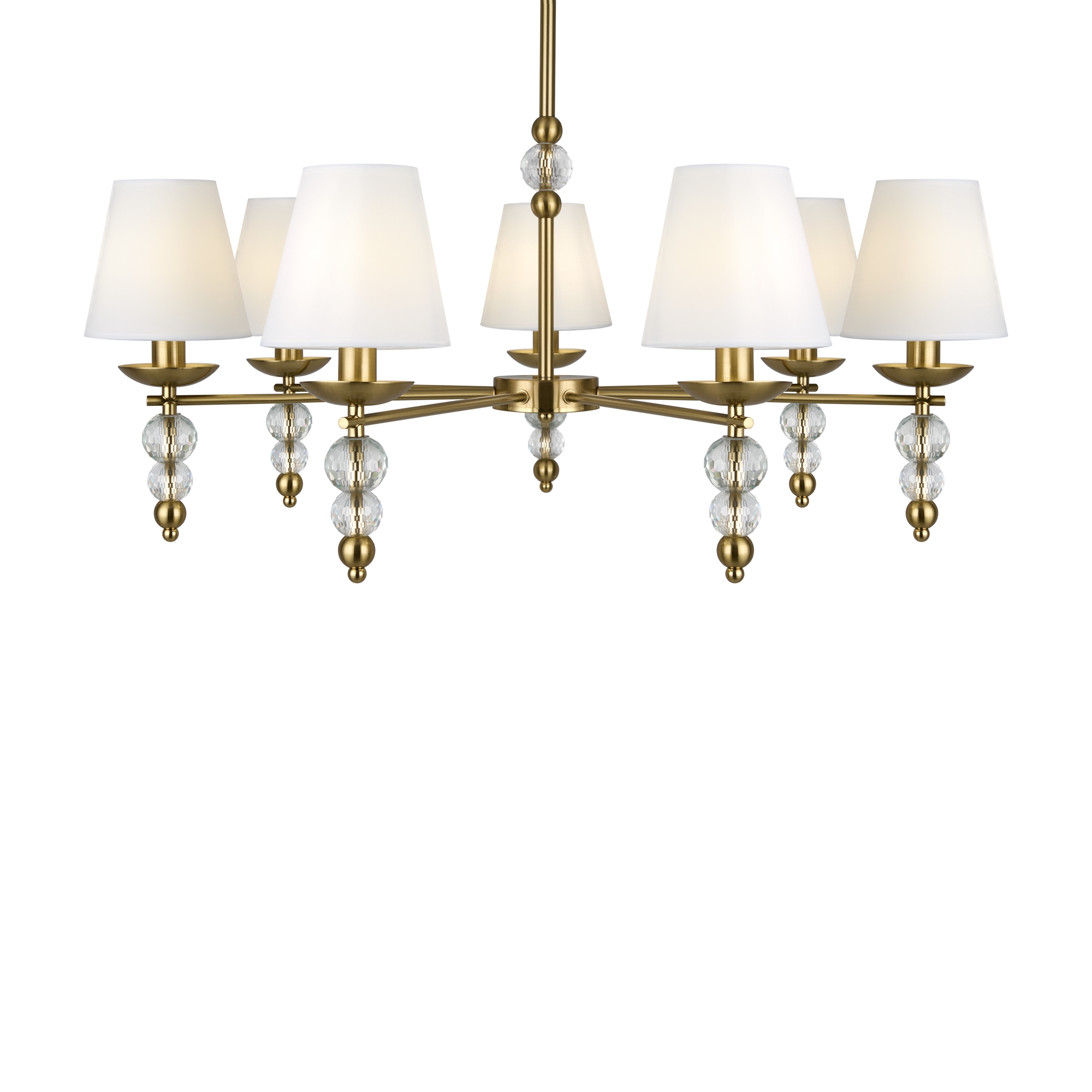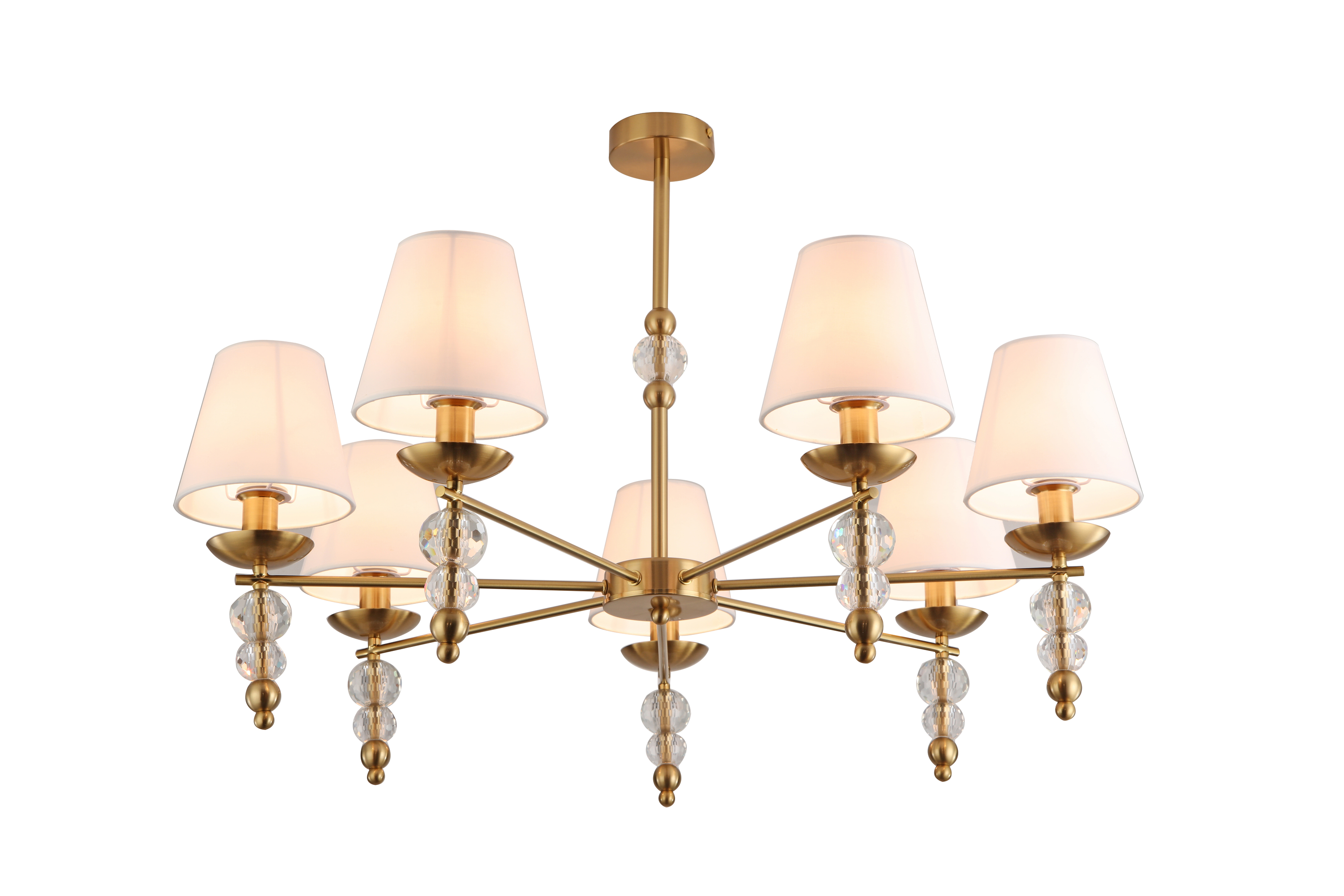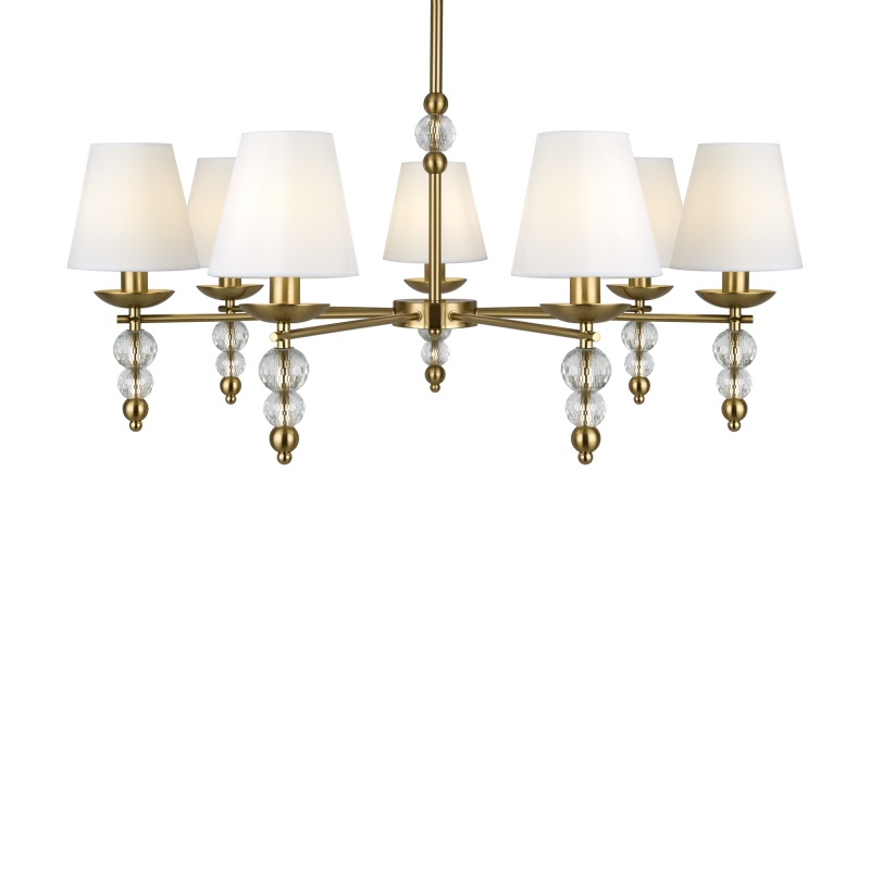 Материал абажура — ткань, цвет — белый. Металлическая арматура в цвете латунь обрамлена хрустальными бусинами. Источник света — лампы с цоколем Е14. Степень защиты — IP20.