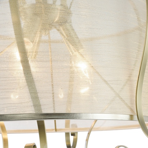 Абажуры и арматура светильников выполнены в разных цветах, с несколькими видами арматуры. Основание люстры украшено стеклянным декоративным элементом, а завитки рожков украшают подвески.