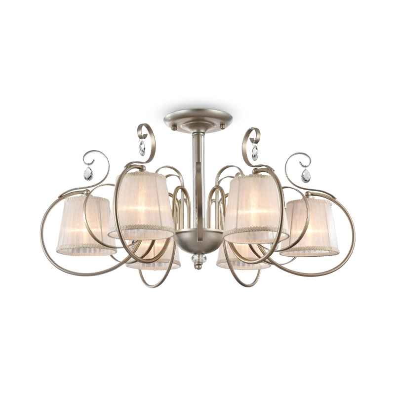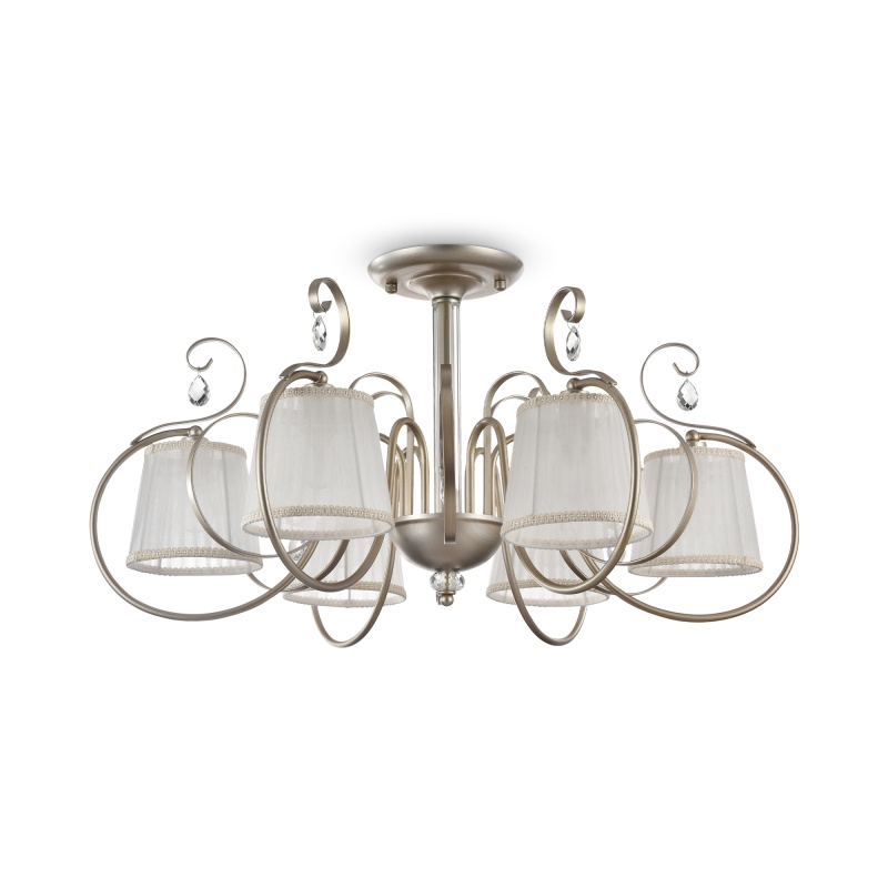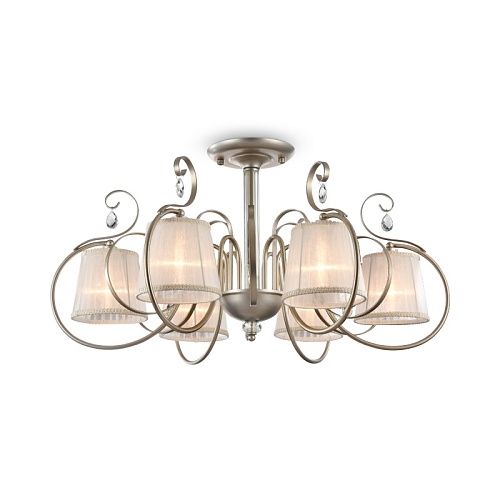 Абажуры и арматура светильников выполнены в разных цветах, с несколькими видами арматуры. Основание люстры украшено стеклянным декоративным элементом, а завитки рожков украшают подвески.