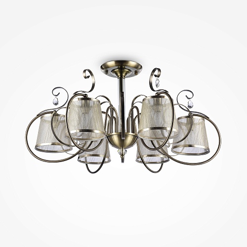 Абажуры и арматура светильников выполнены в разных цветах, с несколькими видами арматуры. Основание люстры украшено стеклянным декоративным элементом, а завитки рожков украшают подвески.