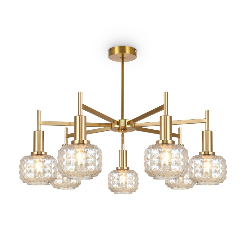 Металлическая арматура в цвете латунь. Плафоны из толстого рельефного стекла в оттенке амбра с «шипованной» огранкой. Подвесные модели регулируется по высоте. Источник света - лампа с цоколем Е14