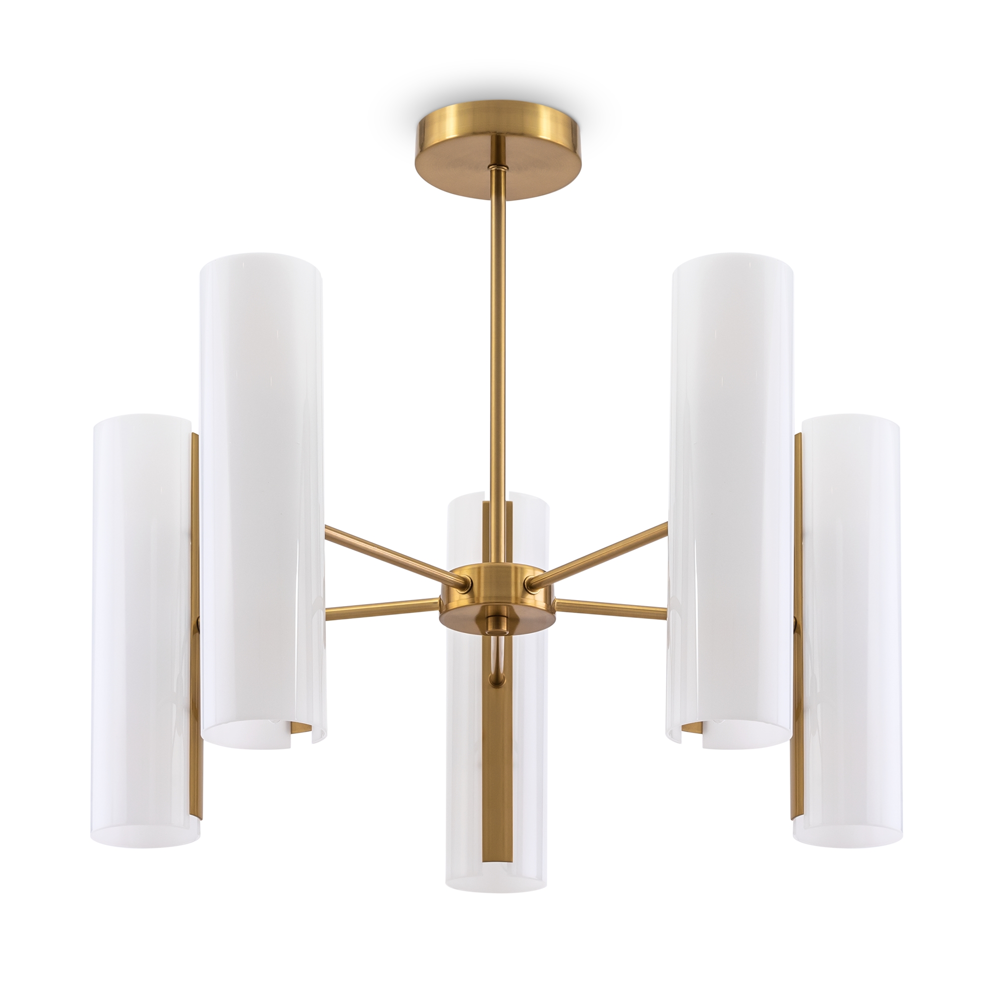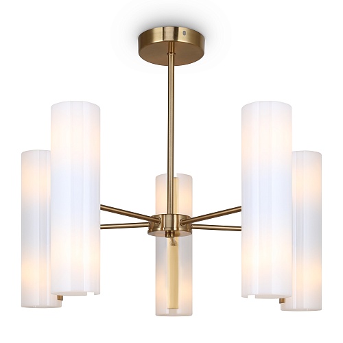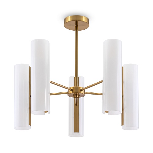 Арматура — металлическая, цвет — латунь. Стеклянные белые плафоны-цилиндры мягко рассеивают свет в стороны. Открытые края плафонов и глянцевая поверхность дают дополнительный свет в вверх и вниз для максимальной освещенности. Источник света — лампа с цоколем Е14.