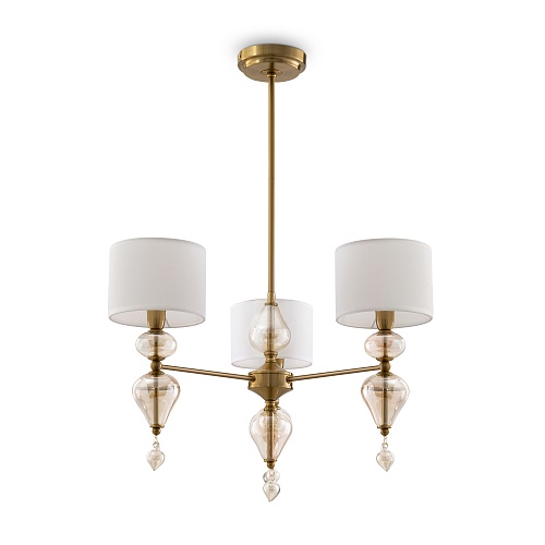 Арматура из металла, цвет — латунь. Плафоны — тканевые, молочного цвета. Металлическая конструкция декорирована выдувными стеклянными элементами с перламутровым напылением. Источником света служит лампа с цоколем Е14.