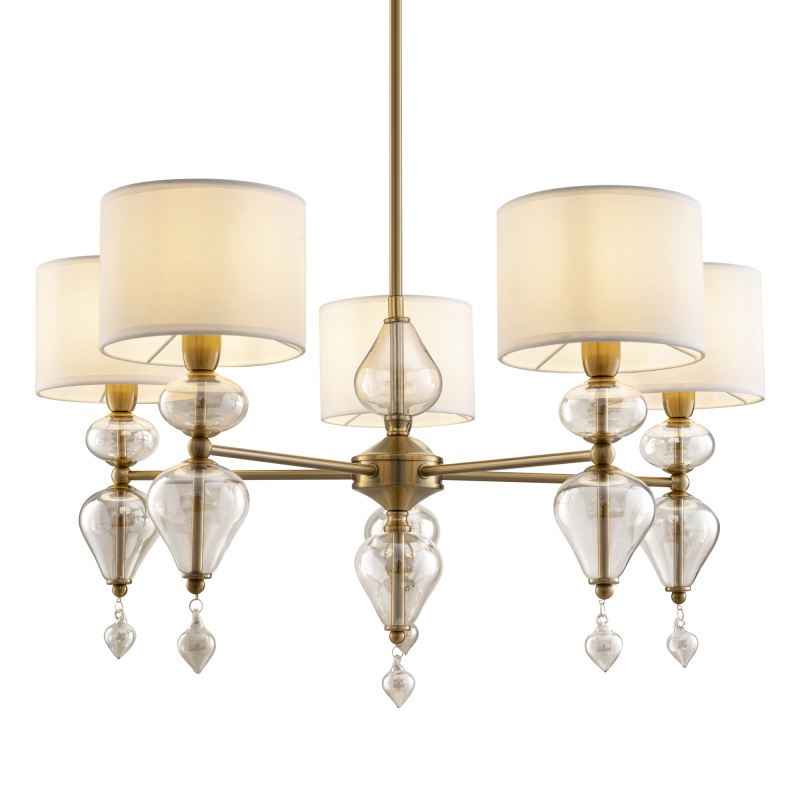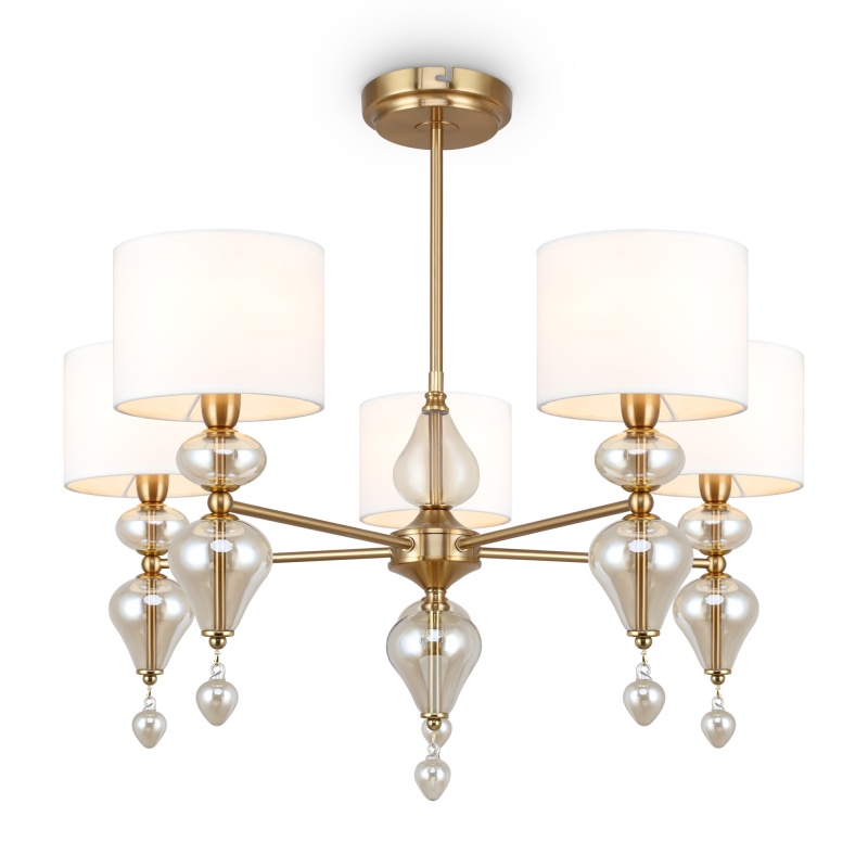 Арматура из металла, цвет — латунь. Плафоны — тканевые, молочного цвета. Металлическая конструкция декорирована выдувными стеклянными элементами с перламутровым напылением. Источником света служит лампа с цоколем Е14.