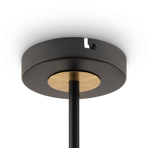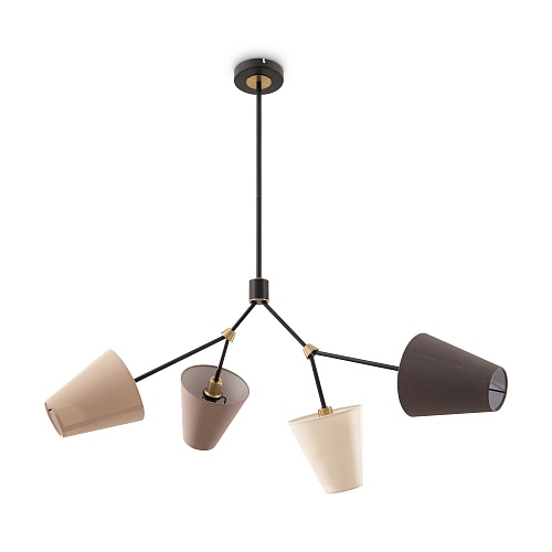 Арматура - металл, цвет — чёрный. Декоративные крепления и вставки цвета латуни. Тканевые абажуры в форме конуса из микса теплых цветов: бежевый и коричневый. Открытые верхние основания абажуров пропускают дополнительный свет. Динамичный дизайн в стиле Casual. Источник света — лампа с цоколем Е14.