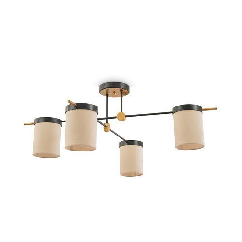Арматура из металла. Основной цвет — чёрный, декоративные элементы в цвете латунь. Тканевые бежевые абажуры-цилиндры украшены чёрными металлическими основаниями. Компактные размеры для невысоких потолков. Источник света — лампа с цоколем Е14.