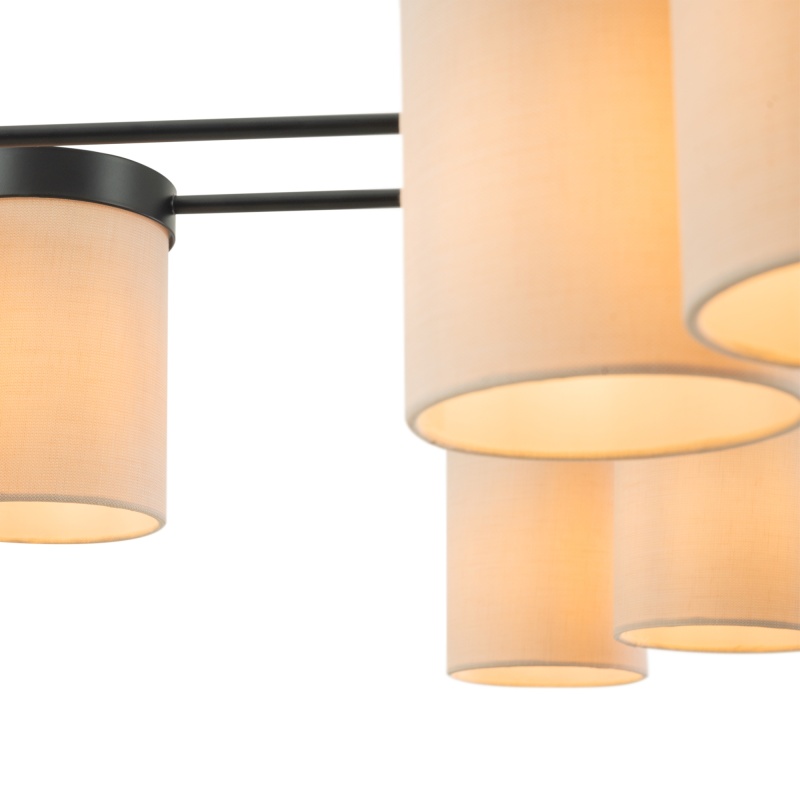 Арматура из металла. Основной цвет — чёрный, декоративные элементы в цвете латунь. Тканевые бежевые абажуры-цилиндры украшены чёрными металлическими основаниями. Компактные размеры для невысоких потолков. Источник света — лампа с цоколем Е14.