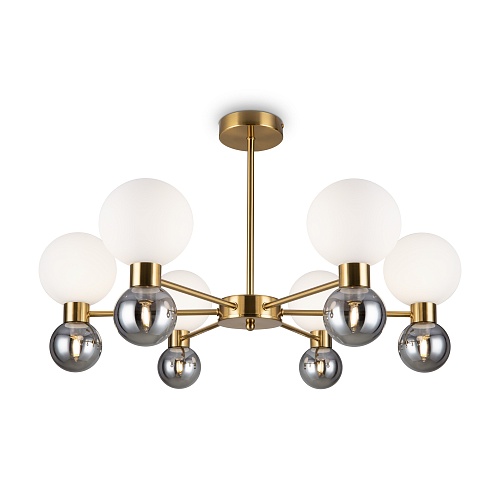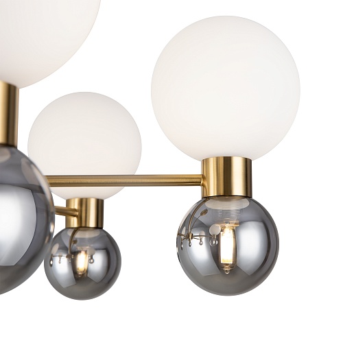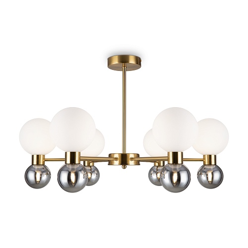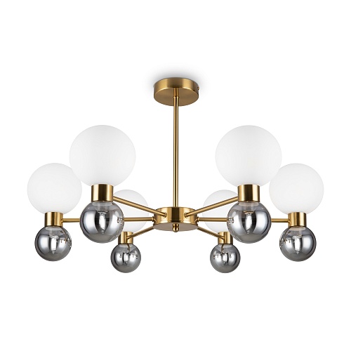 Металлическая арматура в цвете латунь. Открытые сферические плафоны в 2-х цветах: тёплый белый и тёмный гальванизированный. Плафоны разделены металлической вставкой в цвет арматуры. Источником света является лампа с цоколем G9. Для бра - цоколь Е27.