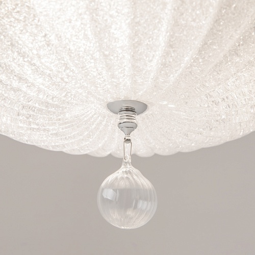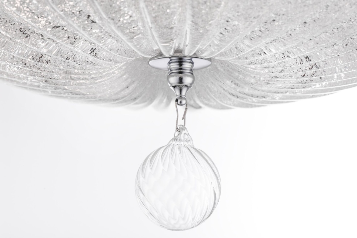 Арматура – металл, цвет – хром. Плафон – прессованное стекло, декор – стеклянная крошка. Подвеска – выдувное рельефное стекло.