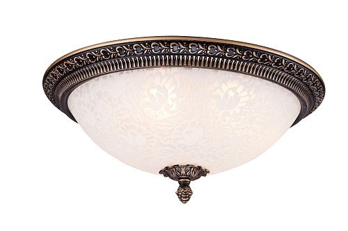 Металлическая арматура, оттенки – античная бронза, белый с золотом. Плафон – матовое стекло, пескоструйный рисунок. Обод и наконечник с прессованным орнаментом.