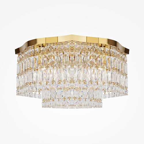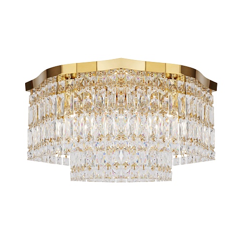 Металлическая арматура в двух оттенках: хром, золото. Декор – прозрачные кристаллы. Потолочные модели имеют два яруса подвесок. Высота подвесной люстры регулируется тросом.