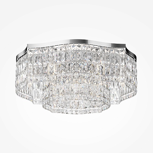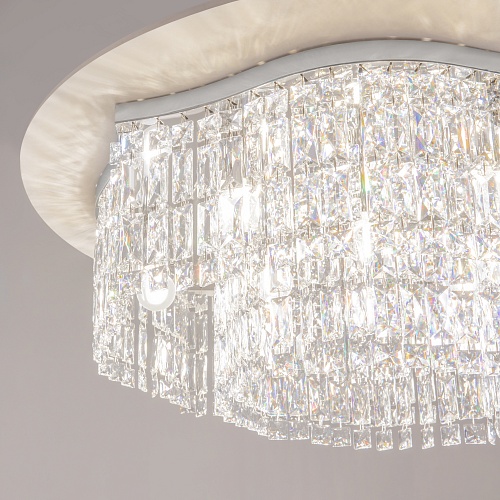 Металлическая арматура в двух оттенках: хром, золото. Декор – прозрачные кристаллы. Потолочные модели имеют два яруса подвесок. Высота подвесной люстры регулируется тросом.