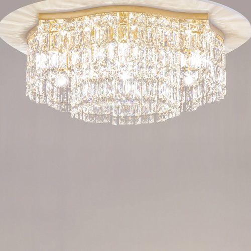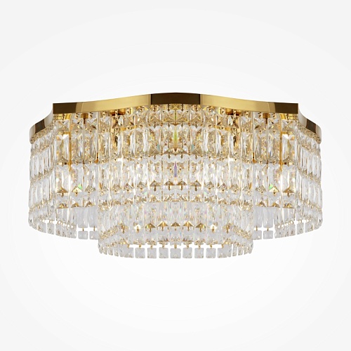 Металлическая арматура в двух оттенках: хром, золото. Декор – прозрачные кристаллы. Потолочные модели имеют два яруса подвесок. Высота подвесной люстры регулируется тросом.