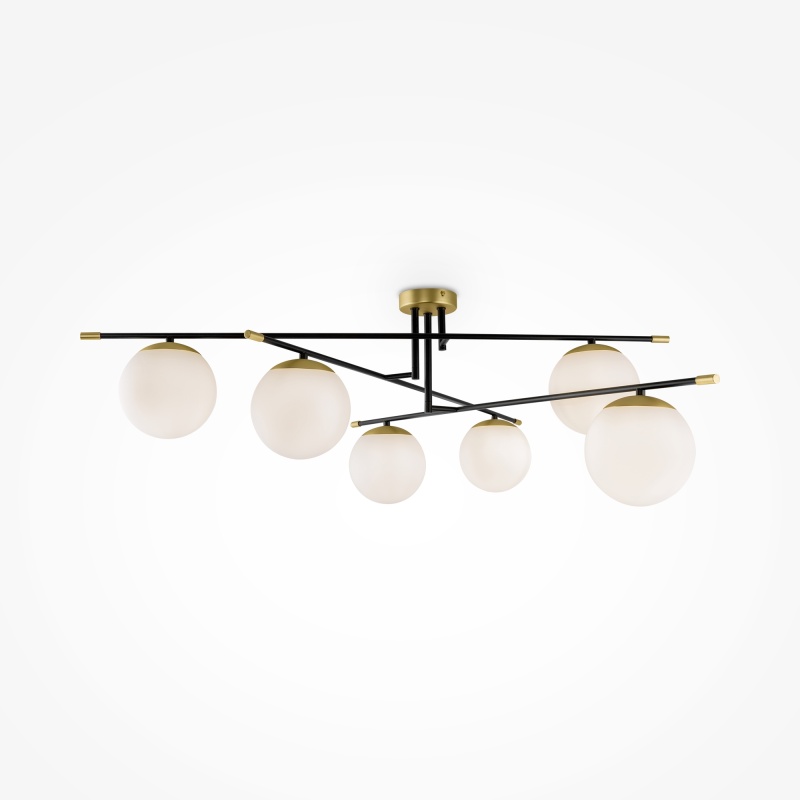 Арматура из металла в цвете матового золота. Плафоны-сферы из матового выдувного стекла. Модная асимметрия в дизайне. Источник света — лампы с цоколем Е14.