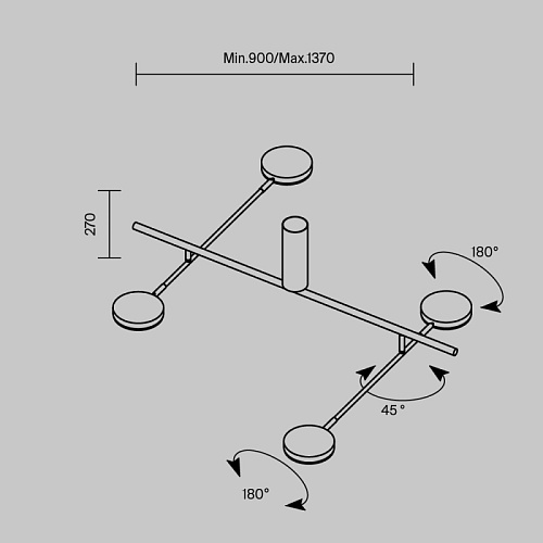 Плафоны и арматура из металла. Цвет рассеивателя — белый, арматура черная или белая. Конструкция предусматривает шарнирный механизм, позволяющий регулировать направление света и высоту светильников. Плафоны вращаются на 90 и 360° (в вертикальной и горизонтальной плоскостях). Угол рассеивания — 120 градусов. Тип света — рассеянный.