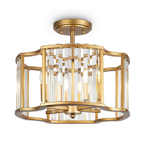 Арматура из металла в золотом цвете. Прозрачный стеклянный декор закреплен на металлическом каркасе, окрашенном в тоне арматуре. Источники света в форме свечей.