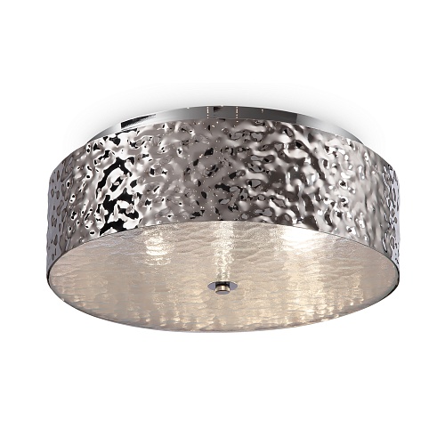Арматура – металл в цветах хром и золото. Фактурный рисунок нанесен посредством чеканки. Стекло с рельефной поверхностью скрывает источники света. Декора тивный эффект «рябь на воде». Источник света - лампа с цоколем Е14.