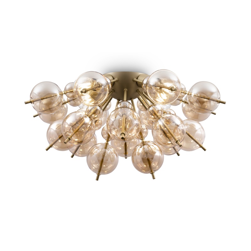 Арматура – металл, оттенки – хром, латунь. Плафоны-сферы из выдувного стекла. Гальваническое покрытие плафонов в двух оттенках: янтарный и дымчатый цвет.