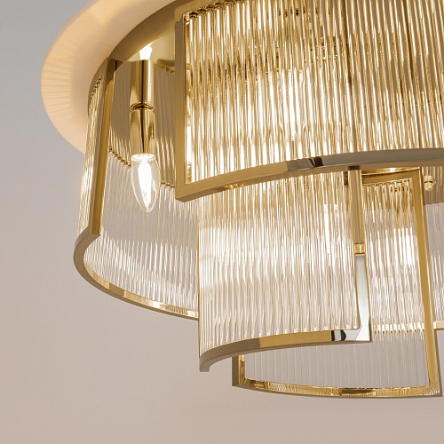 Материал арматуры - металл, цвет - золото. Декоративный элемент из прозрачного стекла в форме рельефных трубок. Цоколь Е14. Лампы в комплект не входят.