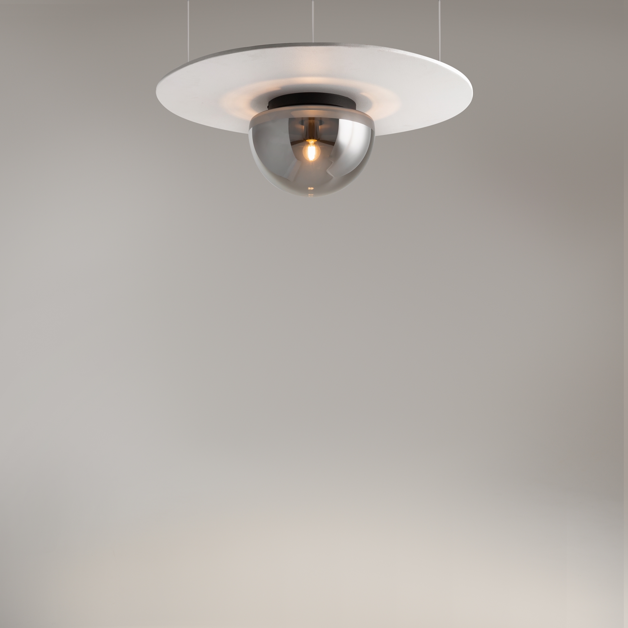 Металлическое основание, цвет - черный, золотой. Плафон-полусфера из стекла в двух цветах: глянцевый дымчато-черный, белый матовый. Компактная высота - подходит для помещений с невысокими потолками. Источник света - лампа с цоколем Е27.