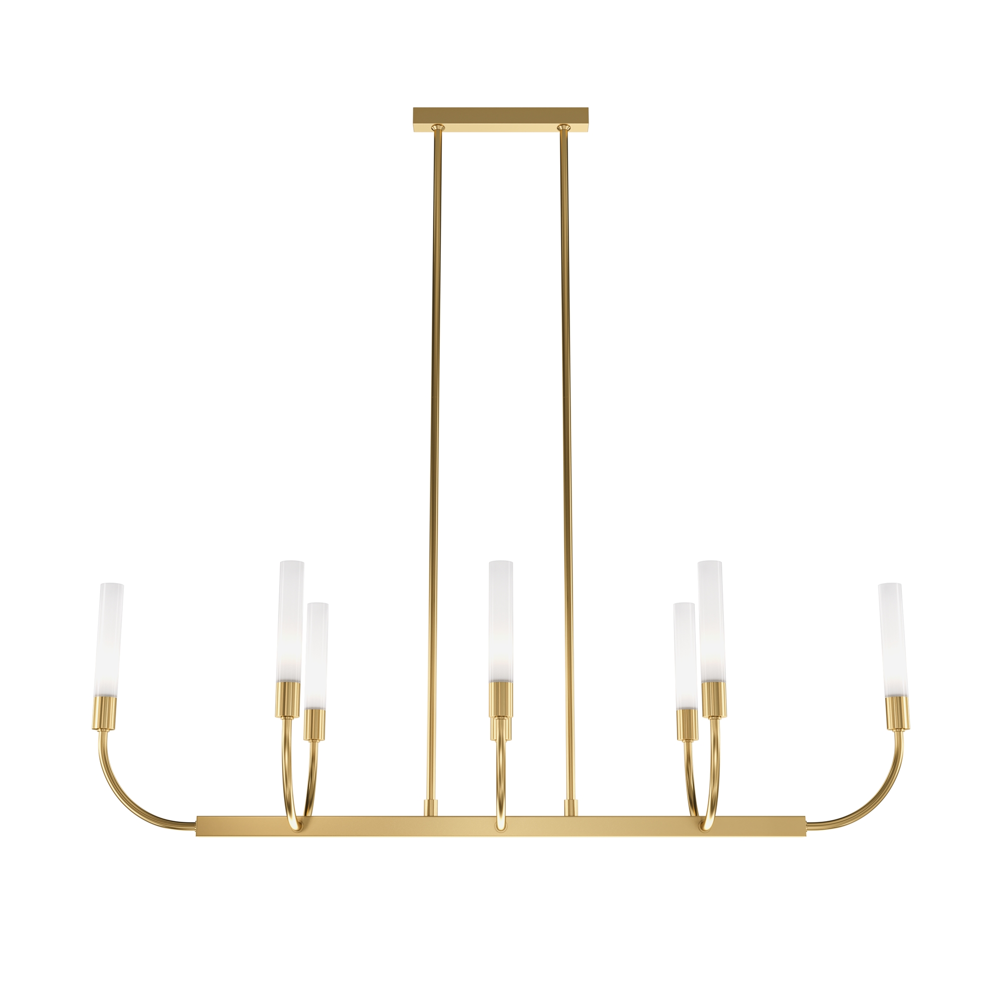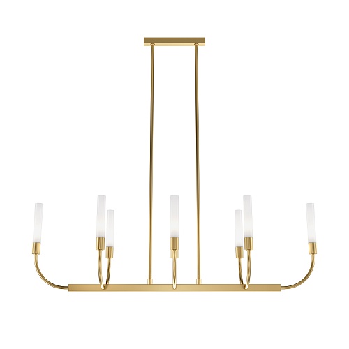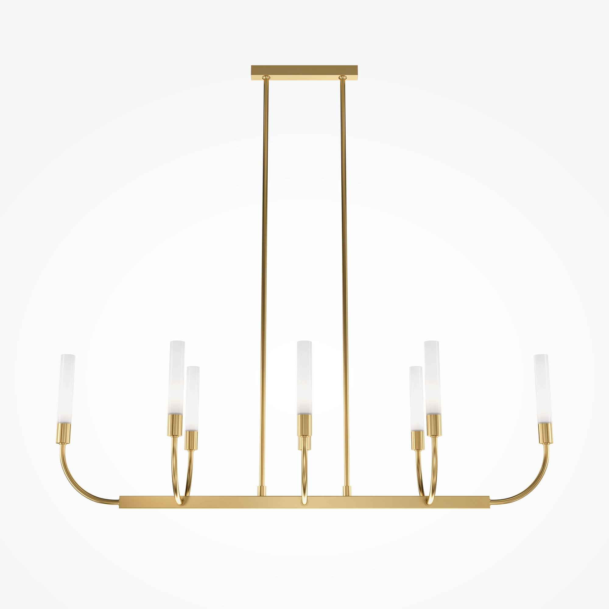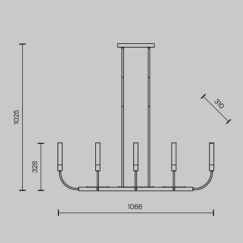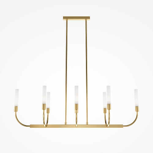 Металлическая арматура. Цвет — латунь. Плафоны-цилиндры — матовое стекло. Трендовый арочный силуэт. В качестве источников света используются лампы с цоколем G9.