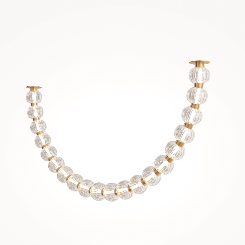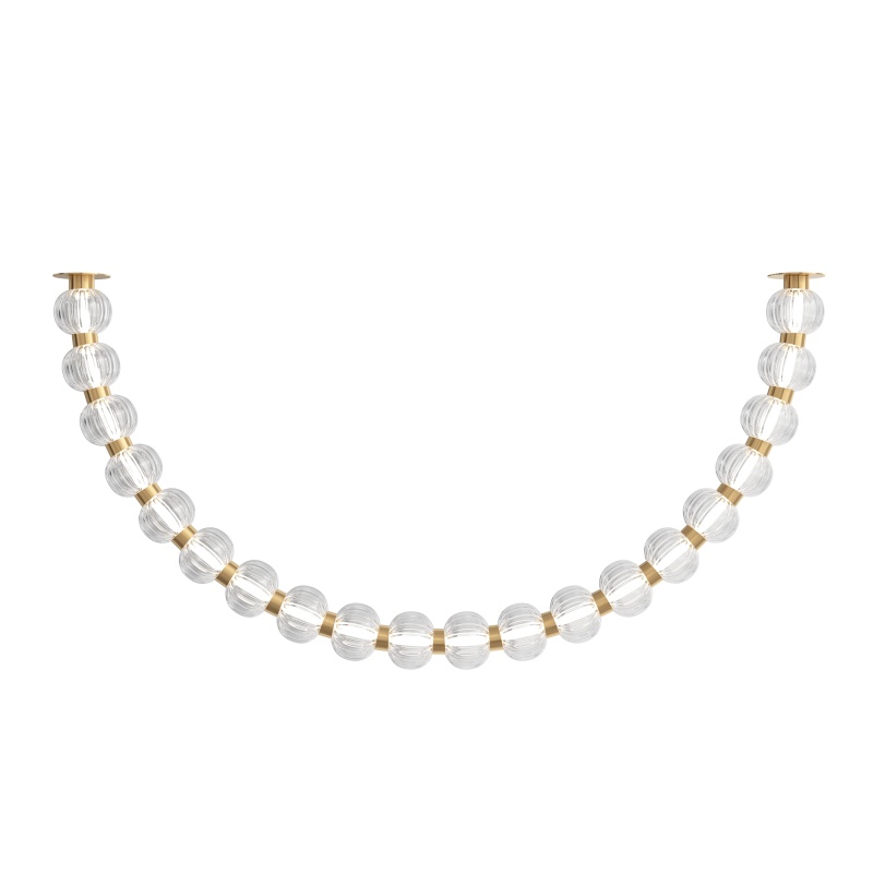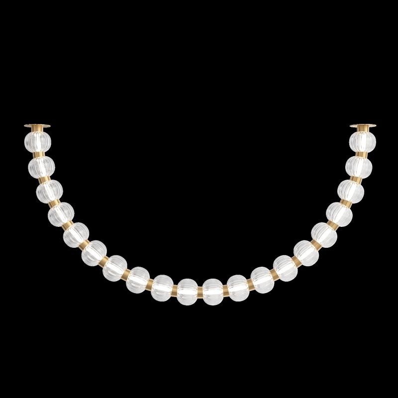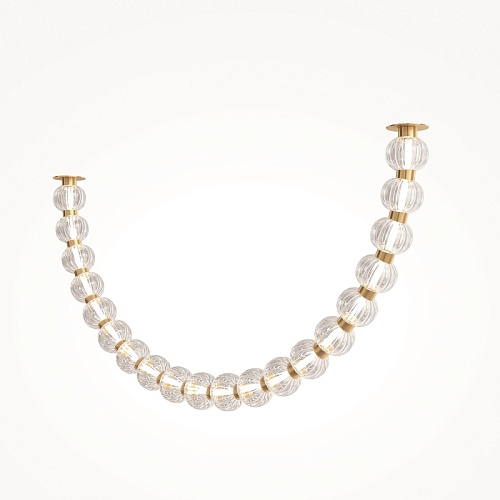 Арматура из металла, цвет – хром. Акцентный декор в виде рельефных сфер из литого стекла. Источник света – светодиодная лента – скрыта под акриловым рассеивателем. Регулируемая высота подвесных светильников.