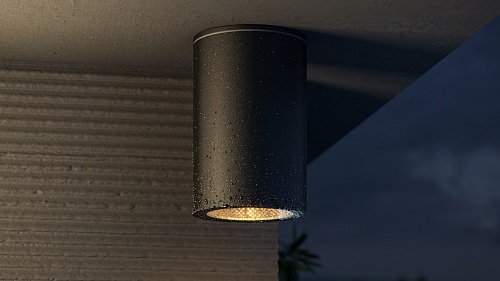 Компактный потолочный светильник. Материал корпуса — алюминий, цвет — черный. Высокий класс защиты IP 54. Корпус устойчив к коррозии и перепадам температур. Источник света — лампа с цоколем GU10.
