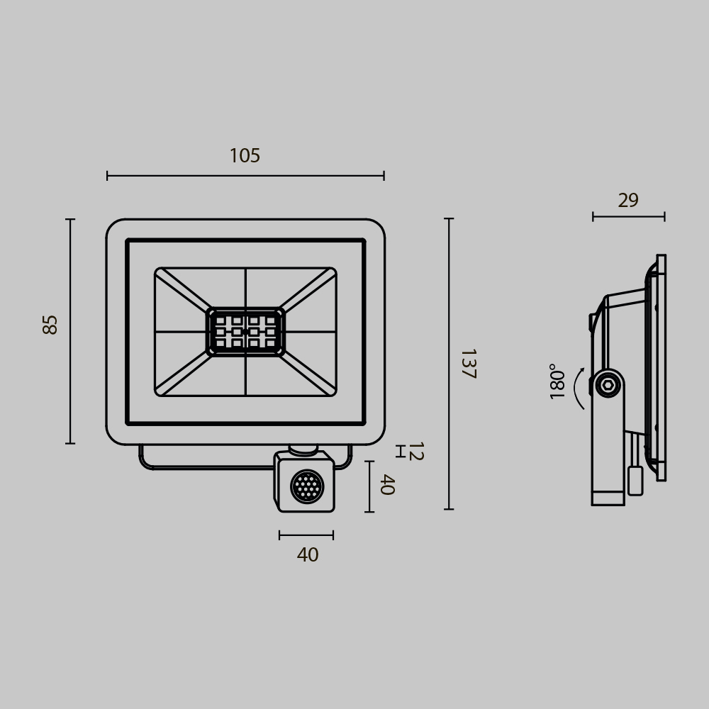 Прожекторы для освещения экстерьеров, рабочих пространств, производственных и промышленных помещений. Материал корпуса — алюминий. Цвет — чёрный. LED-источник света. Два варианта цветовой температуры - 4000К и 6500К. Пять размеров с соответствующими вариантами мощности — 10, 30, 50 Вт с датчиком движения. Модели 100 и 150 Вт без датчиков движения. Высокая степень защиты от пыли и влаги IP65.
