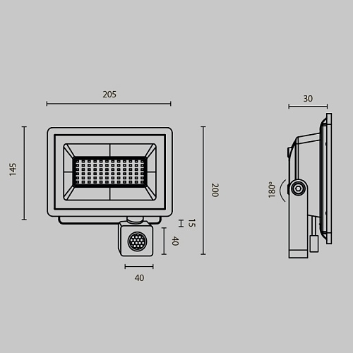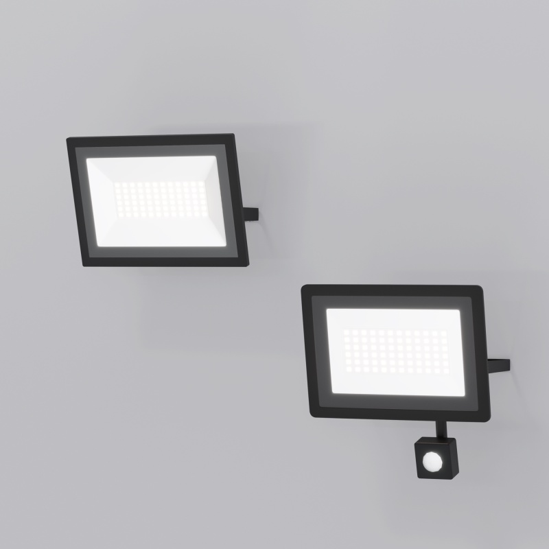 Прожекторы для освещения экстерьеров, рабочих пространств, производственных и промышленных помещений. Материал корпуса — алюминий. Цвет — чёрный. LED-источник света. Два варианта цветовой температуры - 4000К и 6500К. Пять размеров с соответствующими вариантами мощности — 10, 30, 50 Вт с датчиком движения. Модели 100 и 150 Вт без датчиков движения. Высокая степень защиты от пыли и влаги IP65.