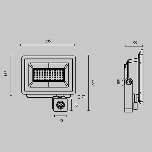Прожекторы для освещения экстерьеров, рабочих пространств, производственных и промышленных помещений. Материал корпуса — алюминий. Цвет — чёрный. LED-источник света. Два варианта цветовой температуры - 4000К и 6500К. Пять размеров с соответствующими вариантами мощности — 10, 30, 50 Вт с датчиком движения. Модели 100 и 150 Вт без датчиков движения. Высокая степень защиты от пыли и влаги IP65.