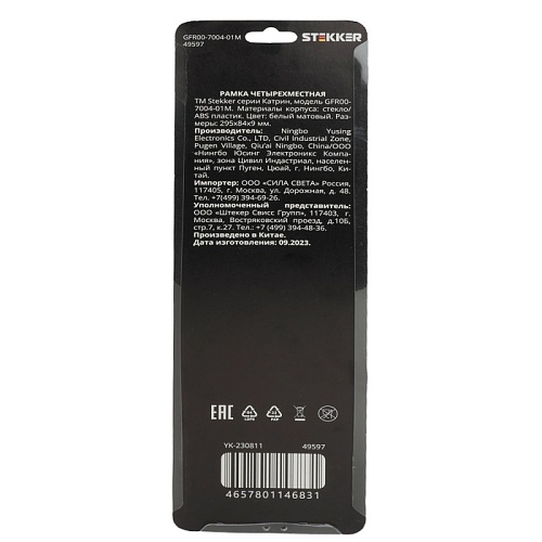 Характеристики Рамка 4-местная, стекло, STEKKER, GFR00-7004-01, серия Катрин, белый матовый