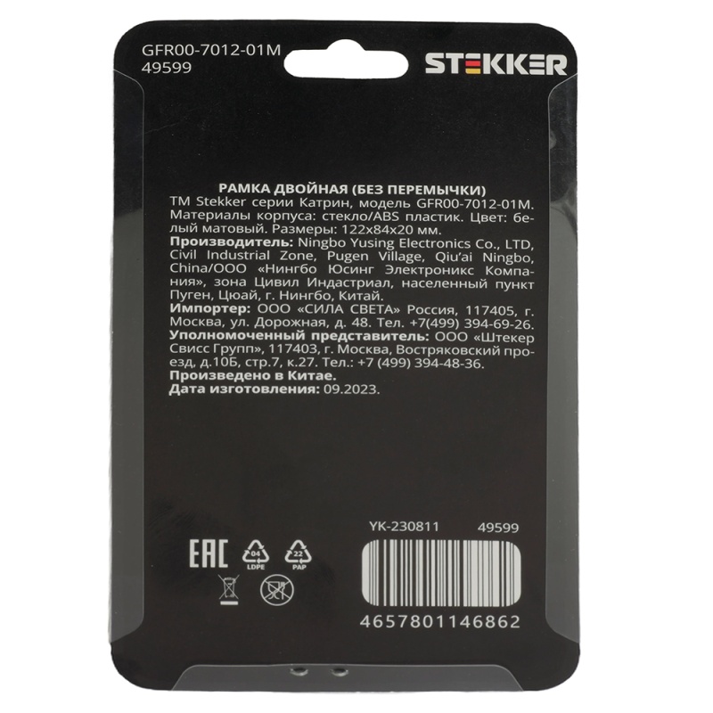 Характеристики Рамка 2-местная (без перемычки), стекло, STEKKER, GFR00-7012-01, серия Катрин, белый