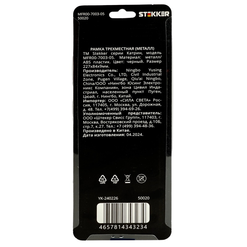 Характеристики Рамка 3-местная, металл, STEKKER MFR00-7003-05, серия Катрин, черный