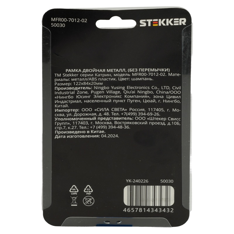 Характеристики Рамка 2-местная (без перемычки), металл, STEKKER, MFR00-7012-02, серия Катрин, шампань