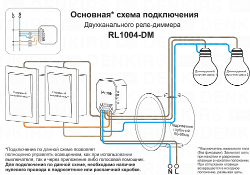 Двухканальное реле-диммер, позволяет управлять двумя группами освещения мощностью до 100 ватт каждая. Помимо включения и выключения, позволяет регулировать яркость свечения светодиодных ламп (используется только со светодиодными лампами поддерживающими регулировку яркости - диммирование) а так же, галогенных ламп и ламп накаливания.\nПодключается к сети Wi-Fi частотой 2,4Ггц. Управляется смартфоном или планшетом под управлением Android и iOS, через приложение TuyaSmart, а так же, голосовыми помощниками, в том числе Яндекс.Алиса.\nПозволяет настраивать включение, выключение, изменение яркости источников света по времени и дням недели и многое другое. Срок гарантии 3 года.