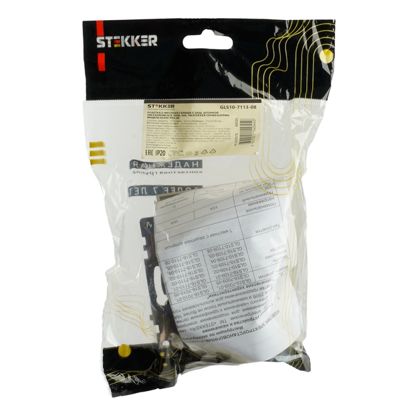 Характеристики GLS10-7113-08 Розетка 2-местная с защитной шторкой (механизм) б/з, 250В, 10А, серия Катрин, золото