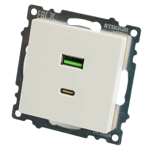 Характеристики Розетка USB 2-местная + type C (механизм), STEKKER GLS10-7116-01, 250В, 3А, max 20W, серия Катрин, белый