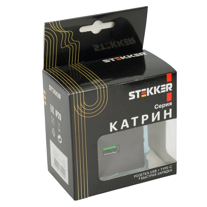 Характеристики Розетка 2-местная USB + type C, STEKKER GLS10-7116-04, 250В, 3А, max 20W,серия Катрин, шоколад